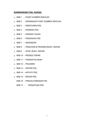 . KANDUNGAN FAIL KUASA BAB 1 - PUSAT SUMBER SEKOLAH BAB 2 - ORGANISASI PUSAT SUMBER SEKOLAH BAB 3 - PERATURAN PSS BAB 4 - PROMOSI PSS BAB 5 - SENARAI TUGAS BAB 6 - PENGAWAS PSS BAB 7 - KEWANGAN BAB 8 - PEMILIHAN PESANAN BUKU BAHAN BAB 9 - STOK BUKU BAHAN BAB 10 - PROSES TEKNIK BAB 11 - PENGKATALOGAN BAB 12 -. FAIL KUASA PUSAT SUMBER SEKOLAH. 500 Sumber manusia.
